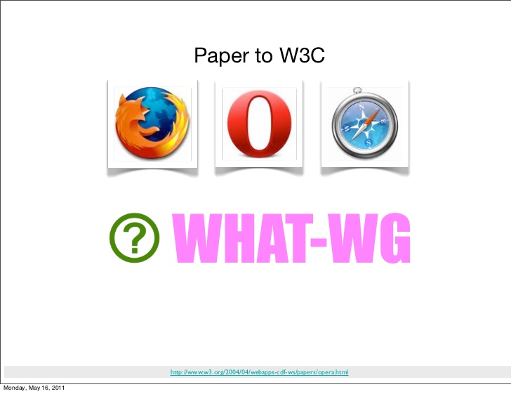 El grup de treball sobre tecnologia d'aplicacions d'hipertext web (WHATWG) és una comunitat de persones interessades en evolucionar HTML i tecnologies relacionades. WHATWG va ser fundat per persones de Apple Inc., la fundació Mozilla i Opera Software, principals proveïdors de navegadors web, el 2004. Google es va unir posteriorment al WHATWG amb el trasllat de l'editor de les especificacions WHATWG, Ian Hickson, a Google (originalment amb Opera).